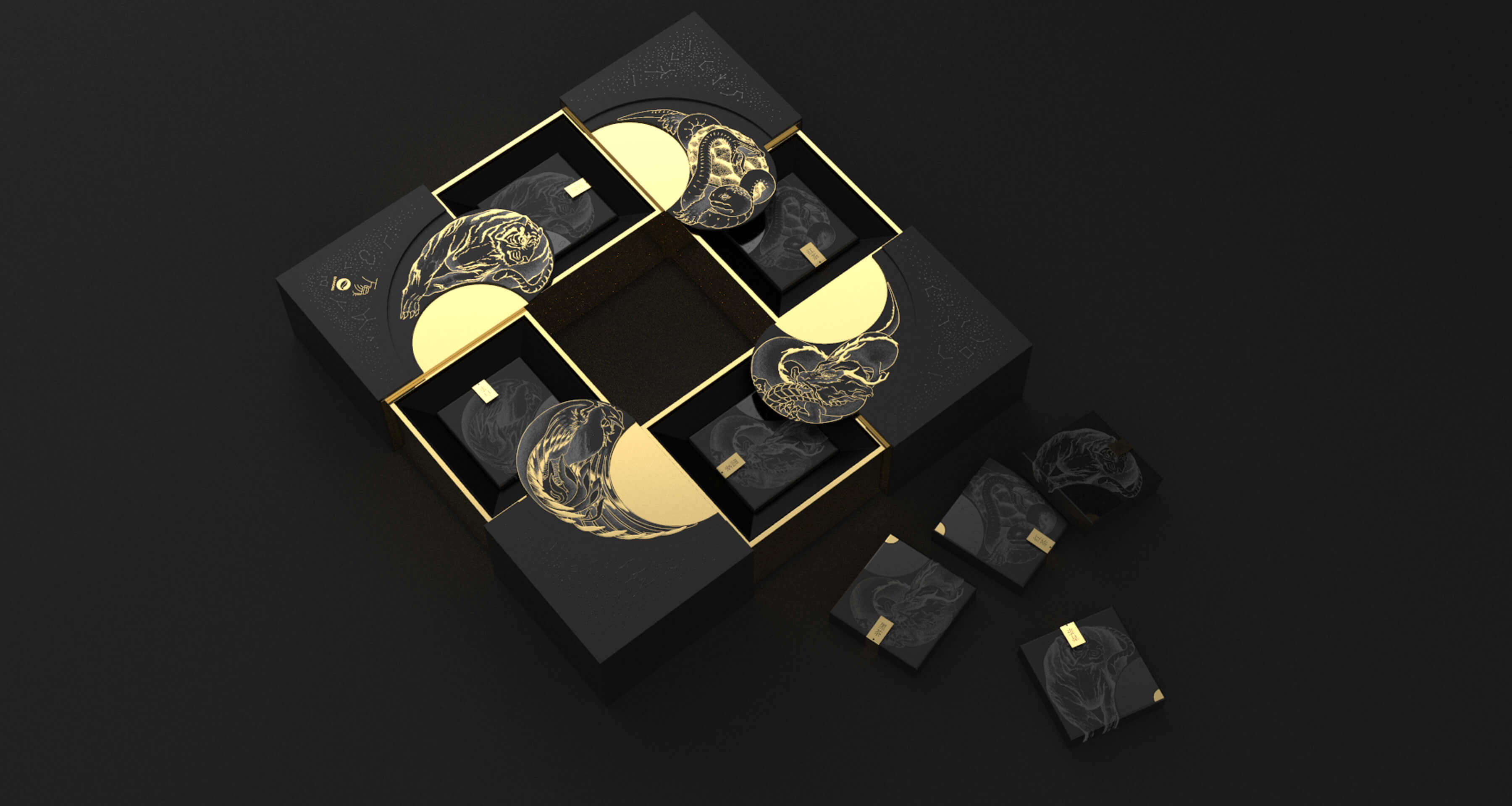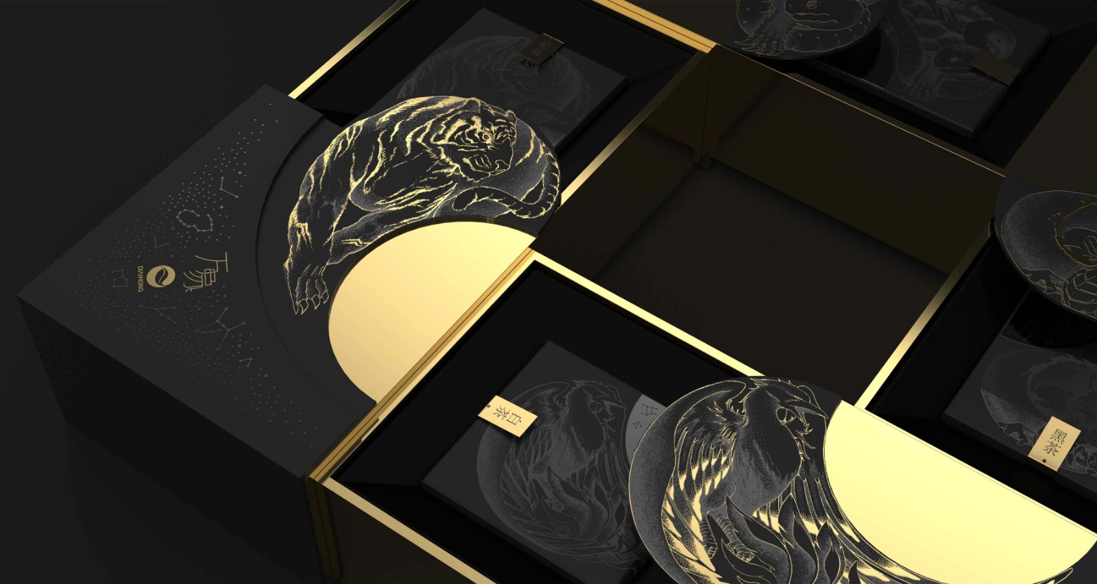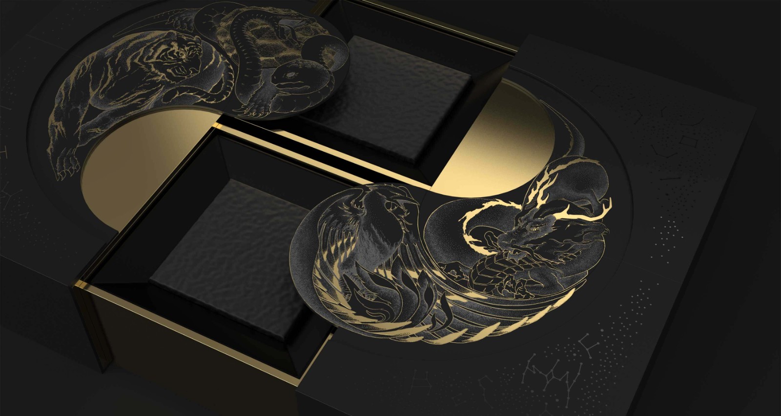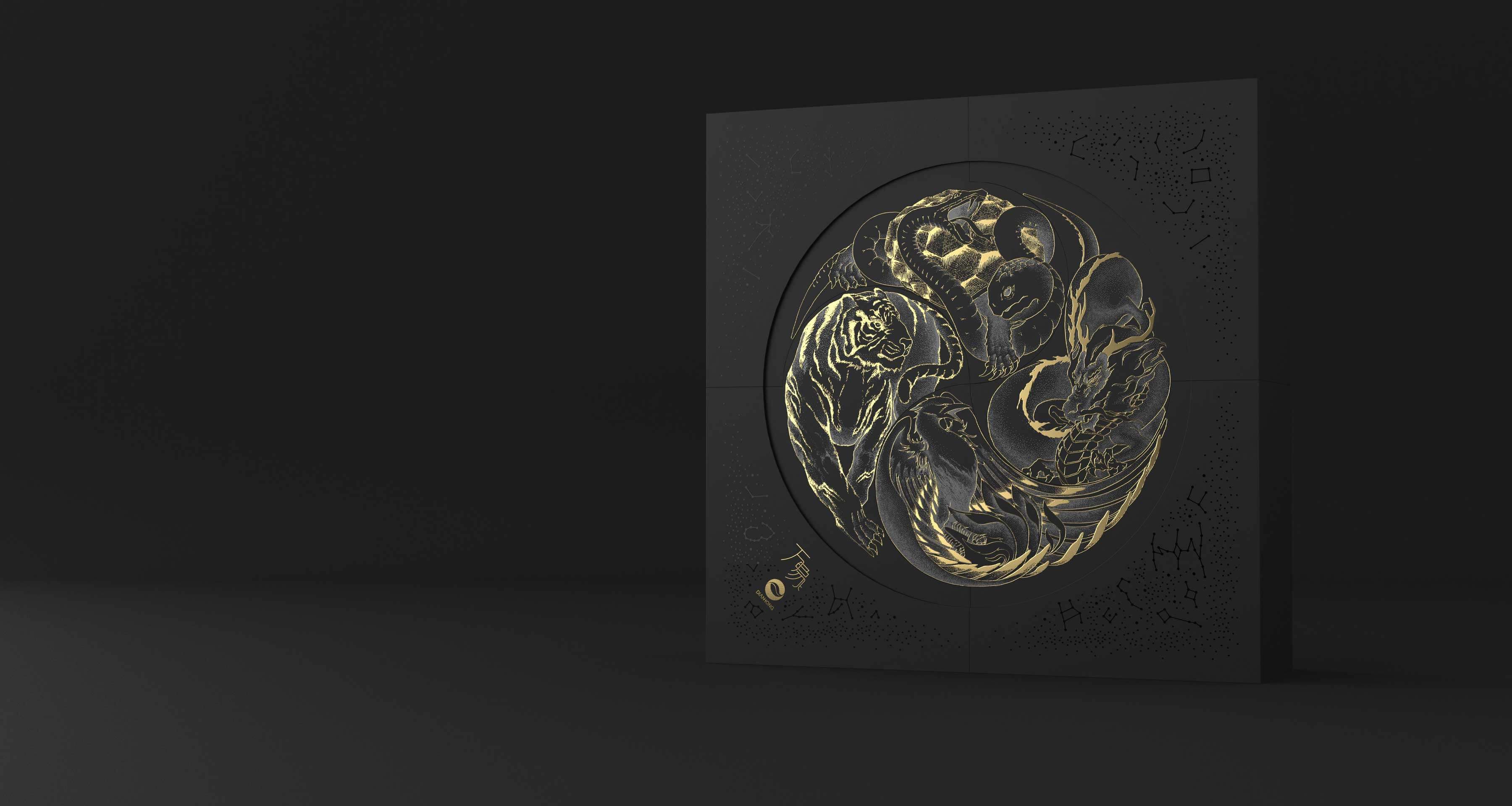 在中國傳統(tǒng)文化中,古人懷著對星空的敬畏及信仰,將天空分成東、西、南、北,用青龍、白虎、朱雀、玄武作為其守護神獸,此為“四象”。因此,在此款產(chǎn)品的創(chuàng)作過程中,