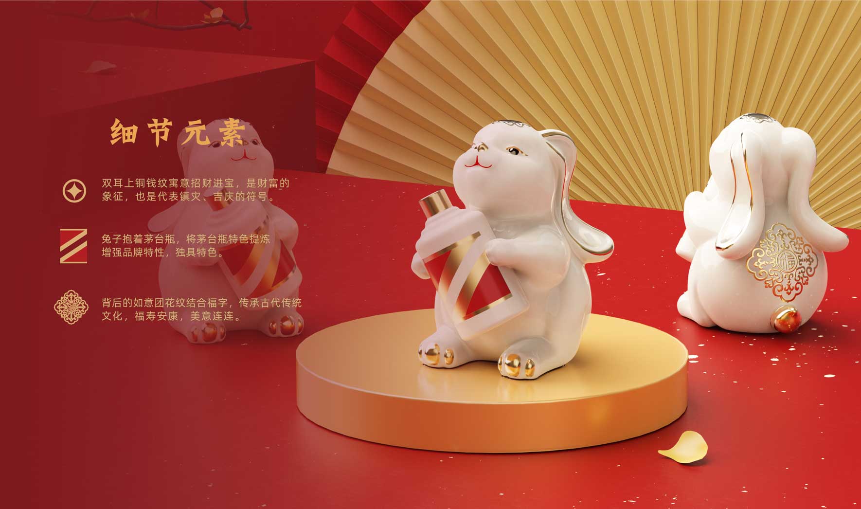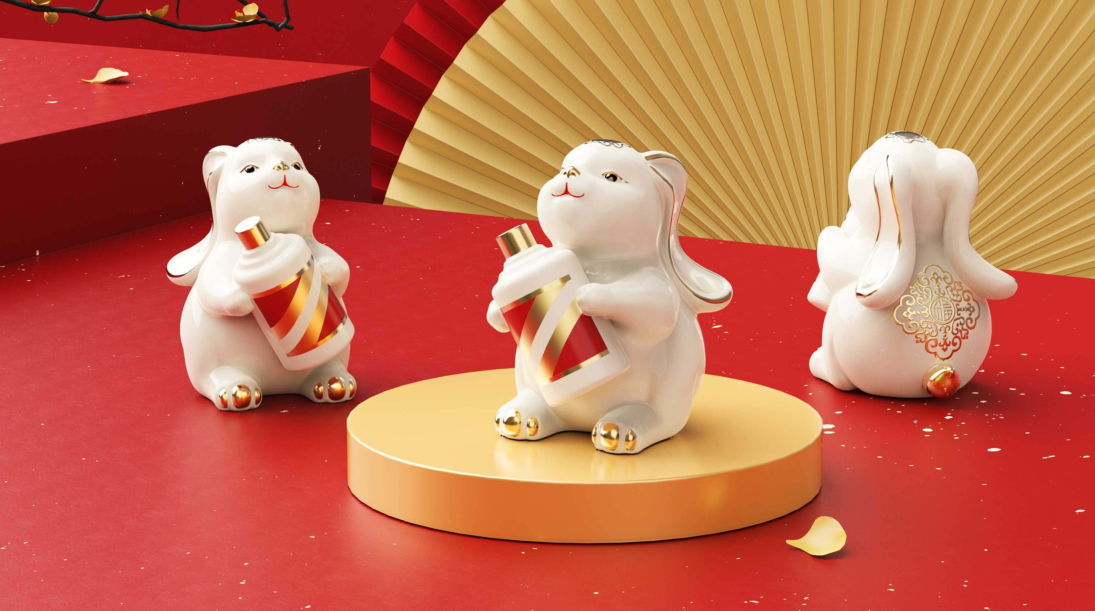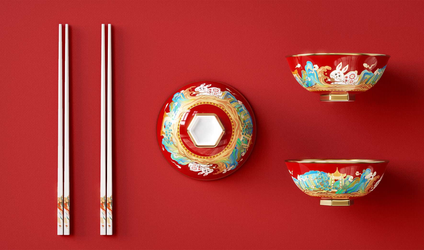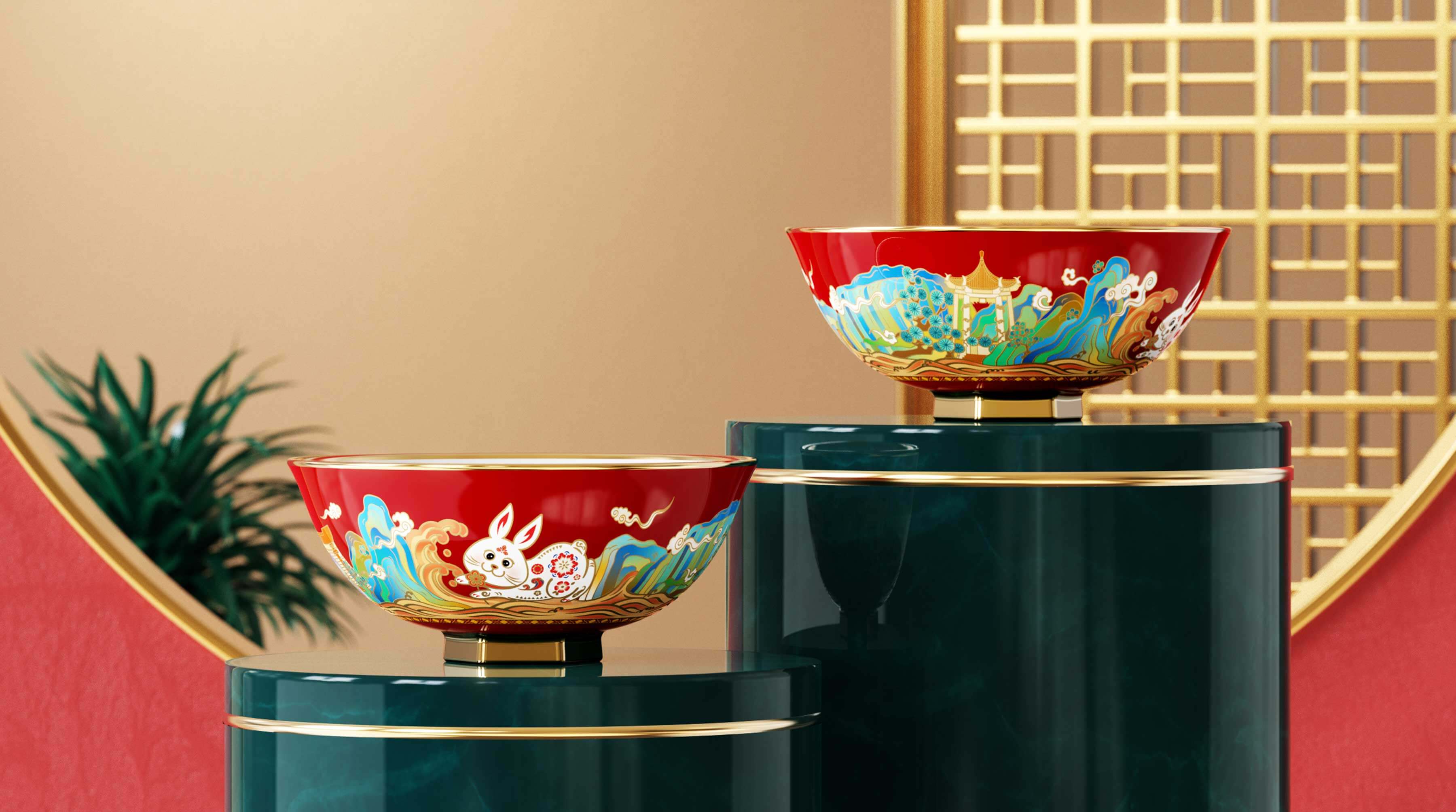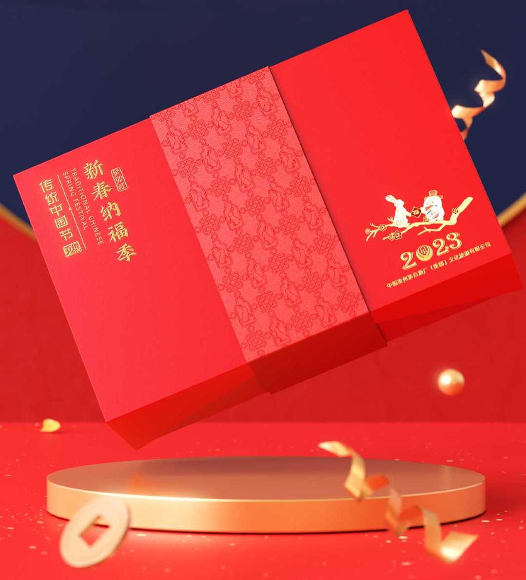吉祥的玉免視覺手執(zhí)新春梅花傳承非遺剪紙技藝,傳遞新春的喜悅與祝福,赤水河環(huán)繞在碗底,寓意福水長流楊柳灣古井、茅臺正大門青綠山水之間,躍然于碗邊傳遞著深厚的茅臺文化,圓碗方底,方圓結合,更顯古韻。