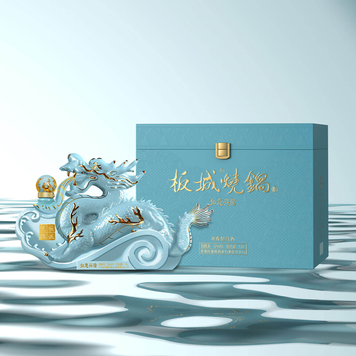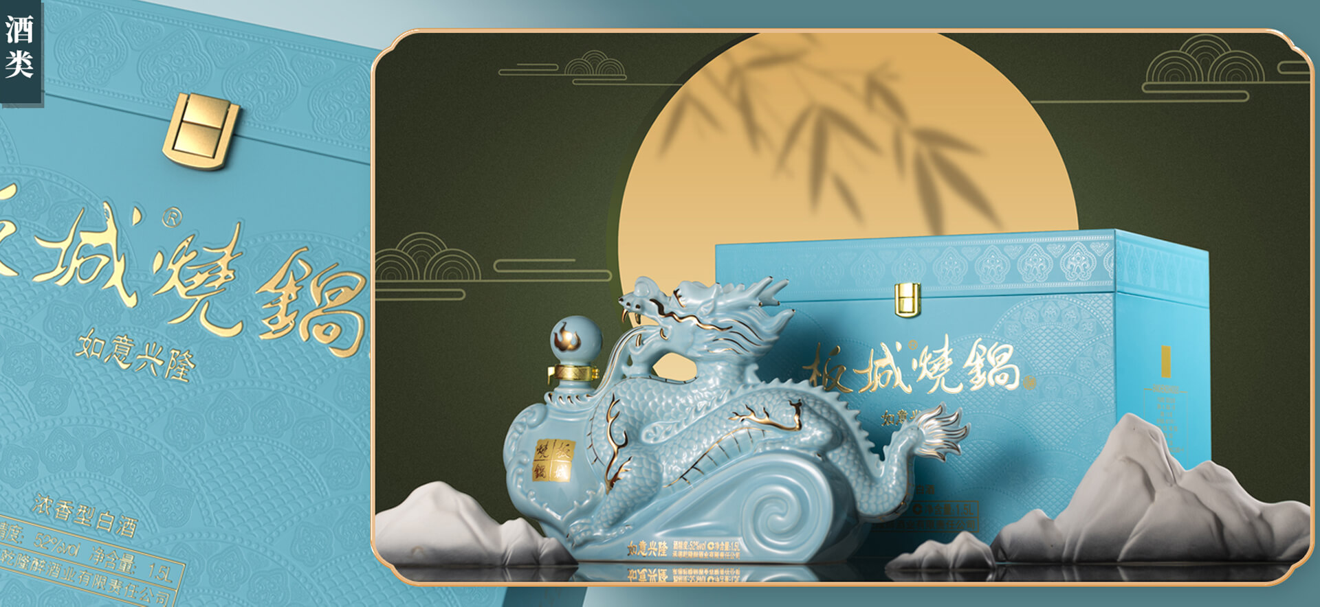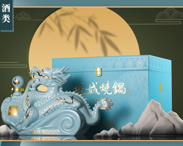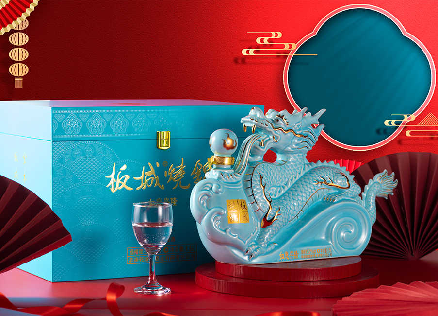 純凈柔和的天青色+典雅的金色,以珍貴的汝窯天青色來(lái)塑造板城龍年生肖酒的珍貴性,收藏性。