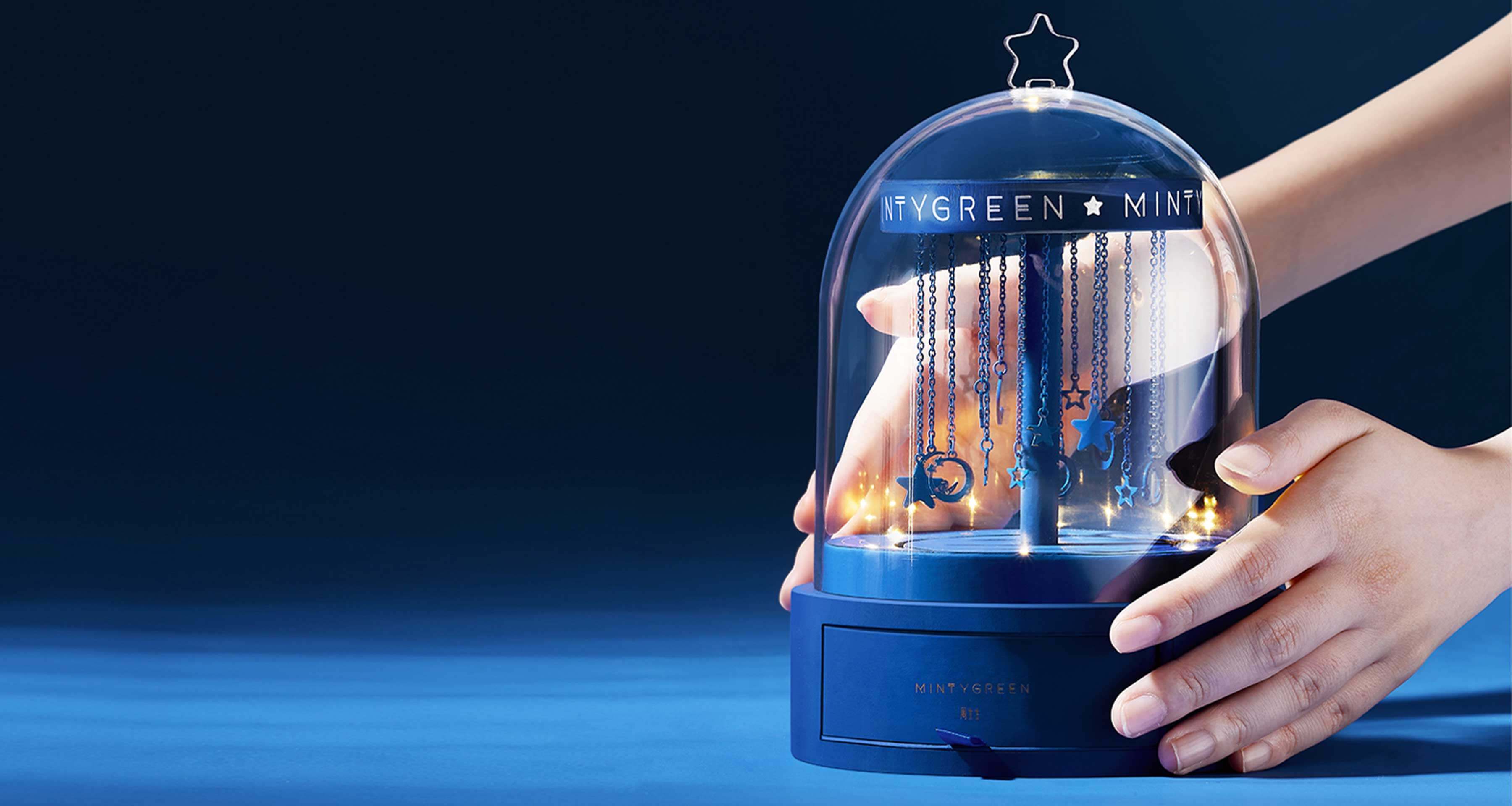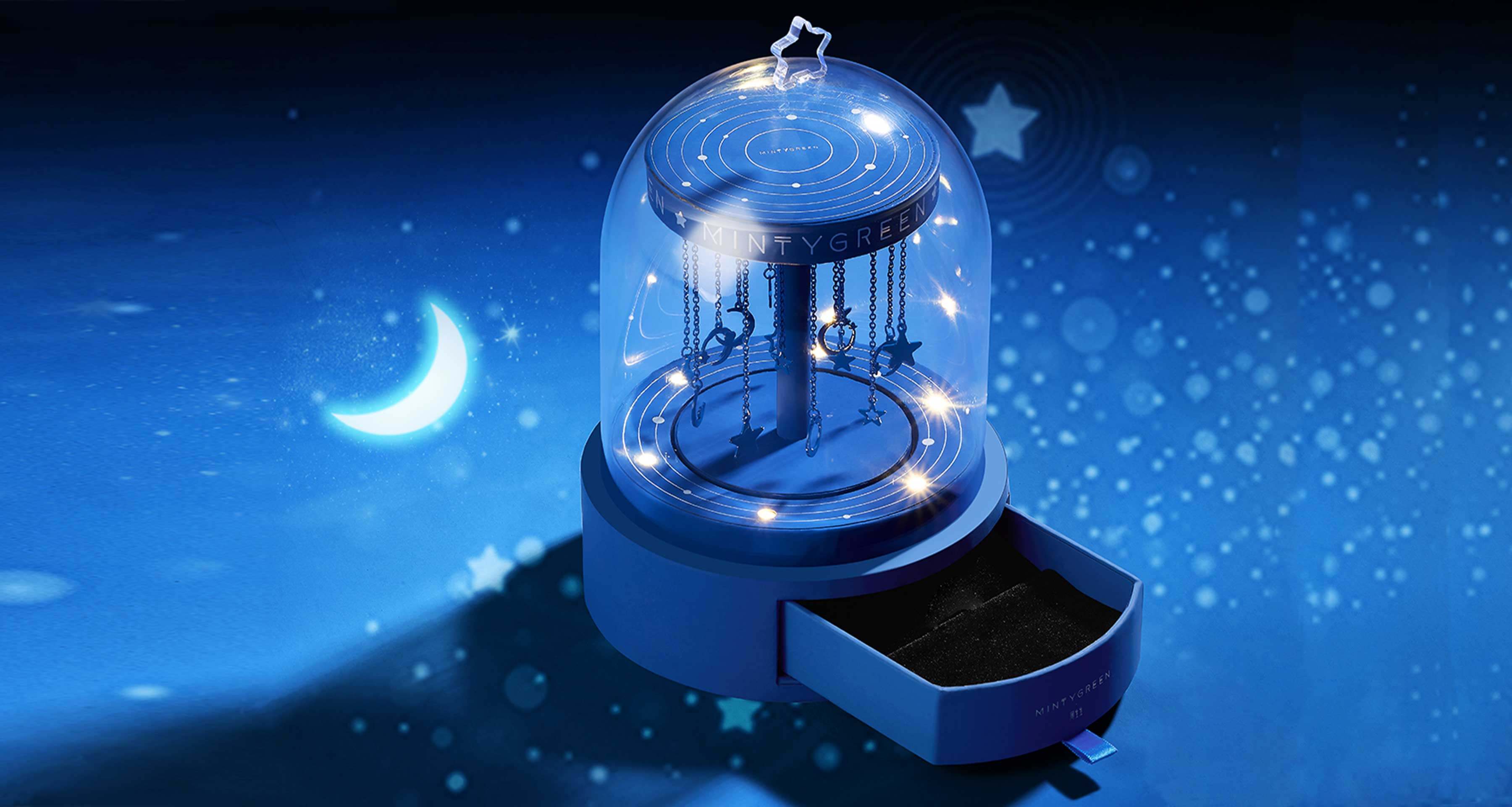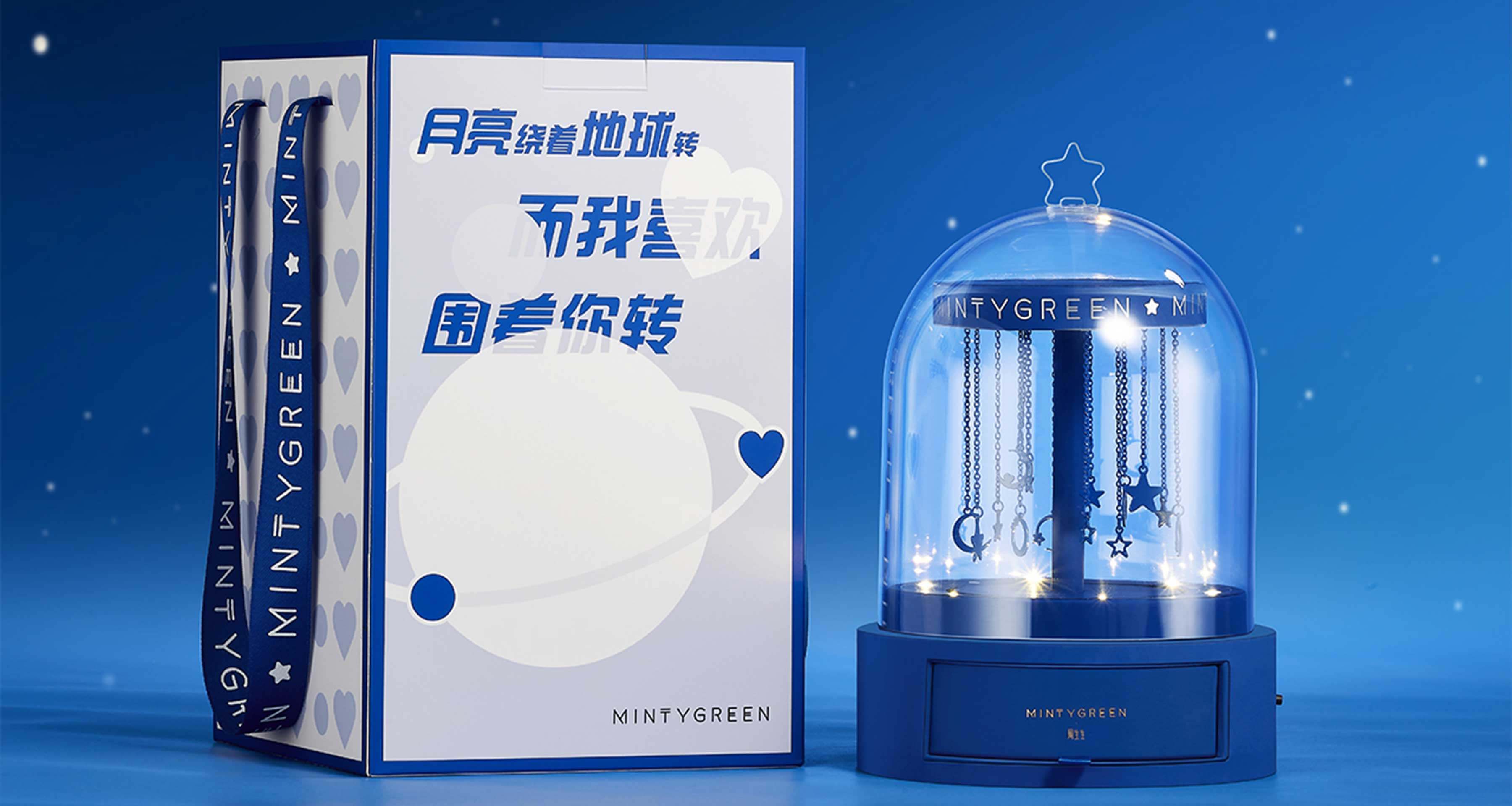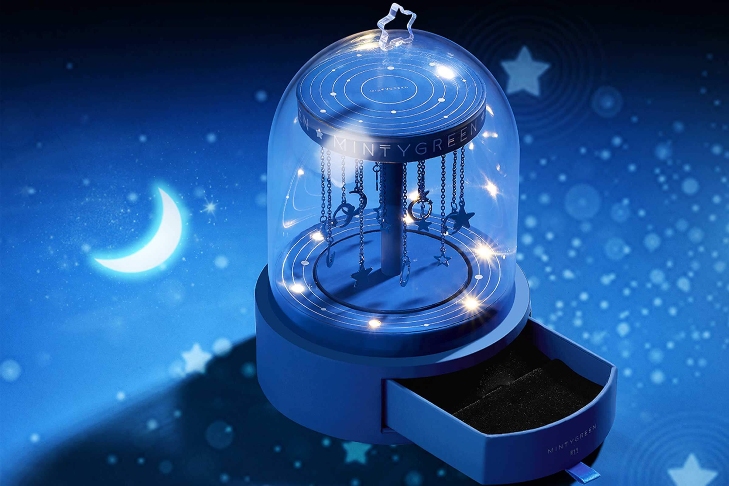 月亮繞地球旋轉(zhuǎn),我則傾心于圍繞你。設(shè)計師以玫瑰花玻璃罩為靈感,象征保護與關(guān)愛,結(jié)合旋轉(zhuǎn)木馬的浪漫,打造專屬女孩的夢幻之作。透明亞克力罩下,星月掛飾點綴,如宇宙星河般浩渺,仿佛七夕的牛郎織女,雖遠隔光年,眼中卻唯有彼此,演繹著不朽的浪漫傳奇。