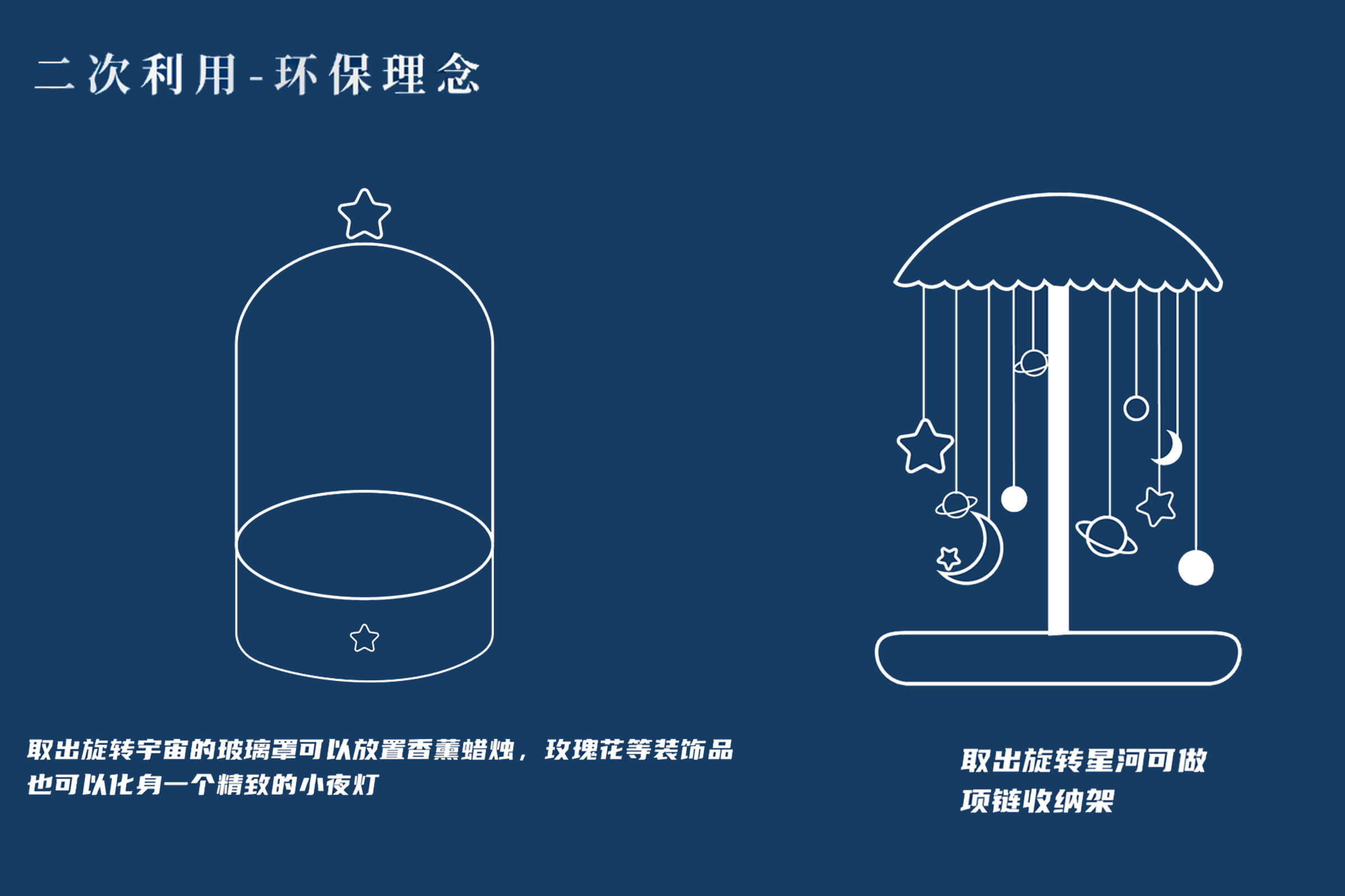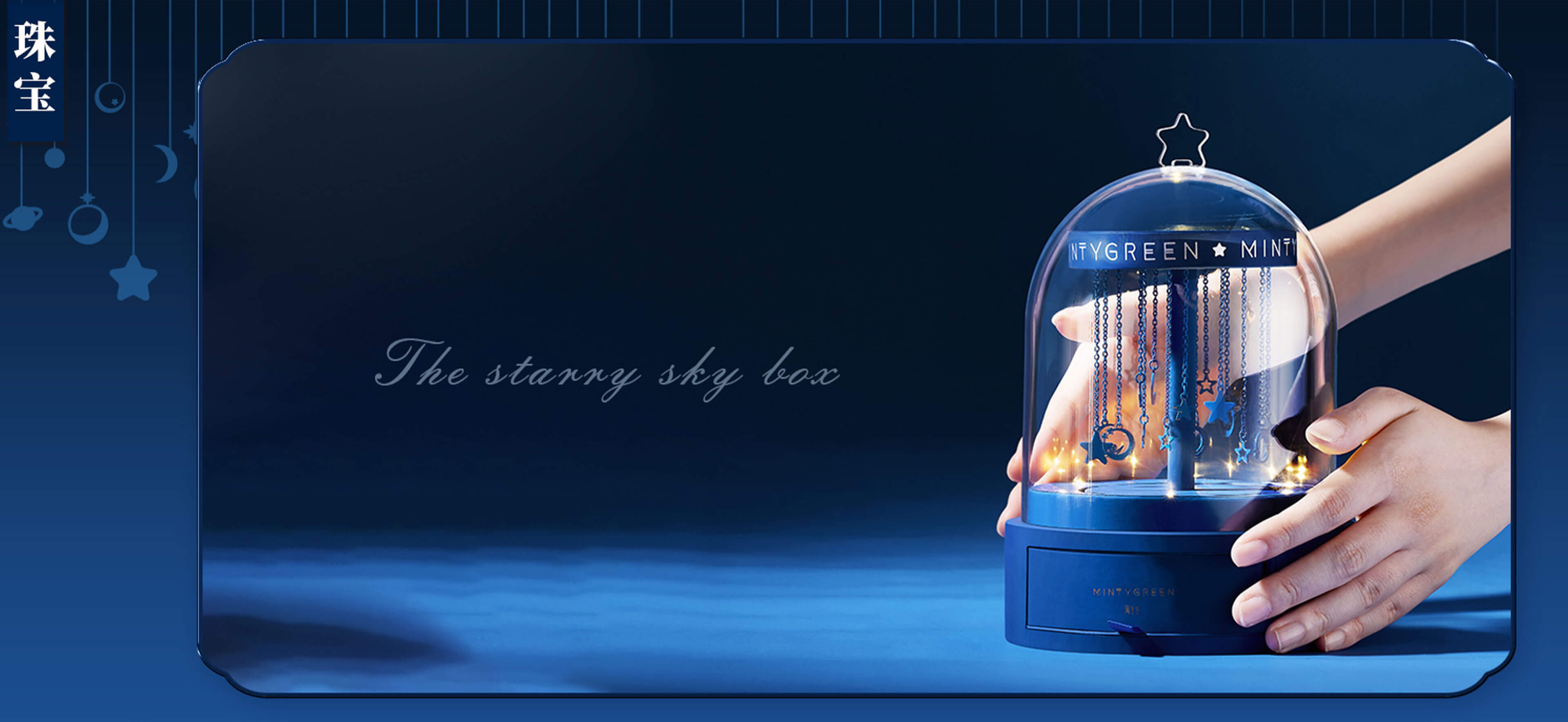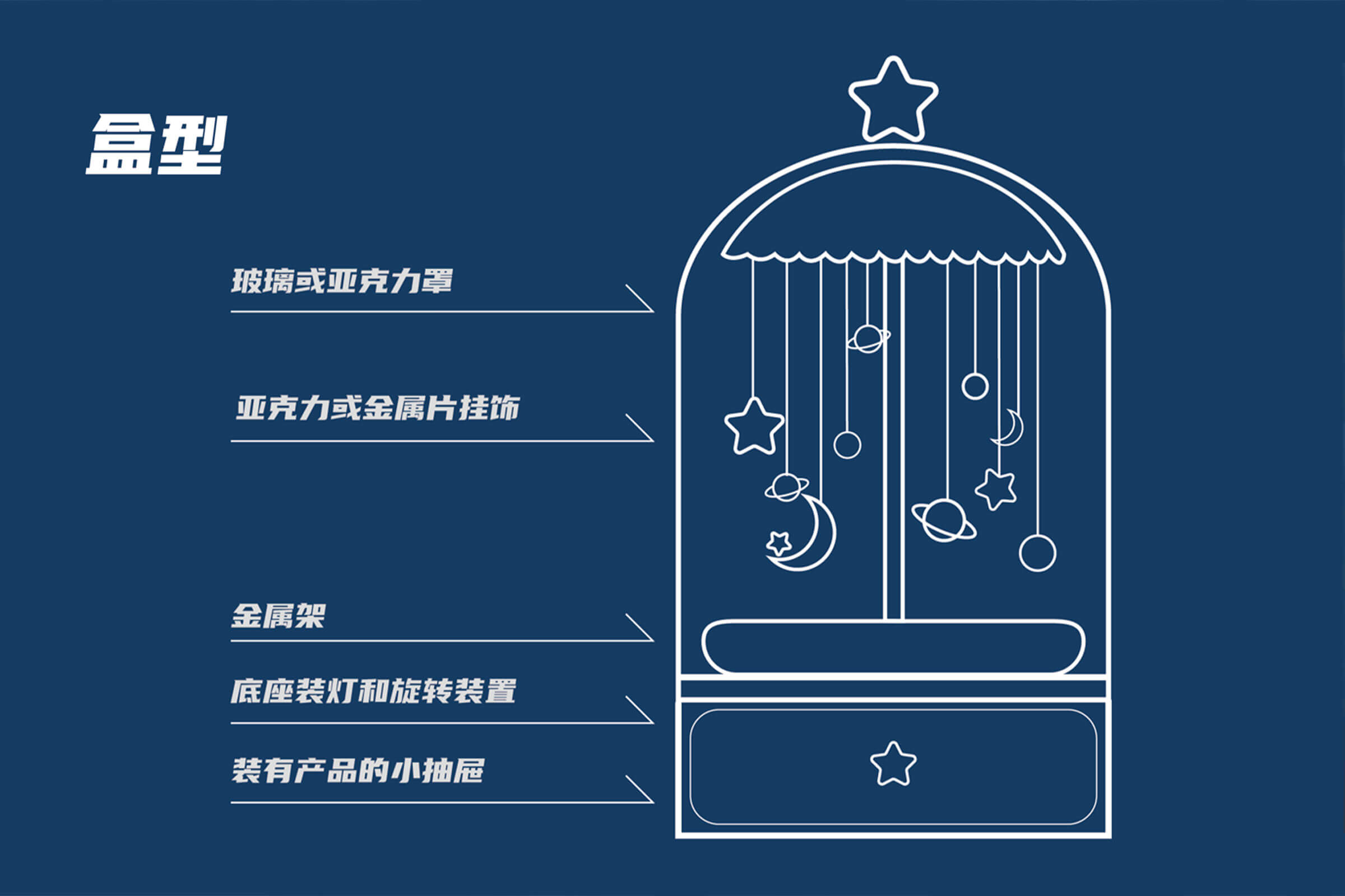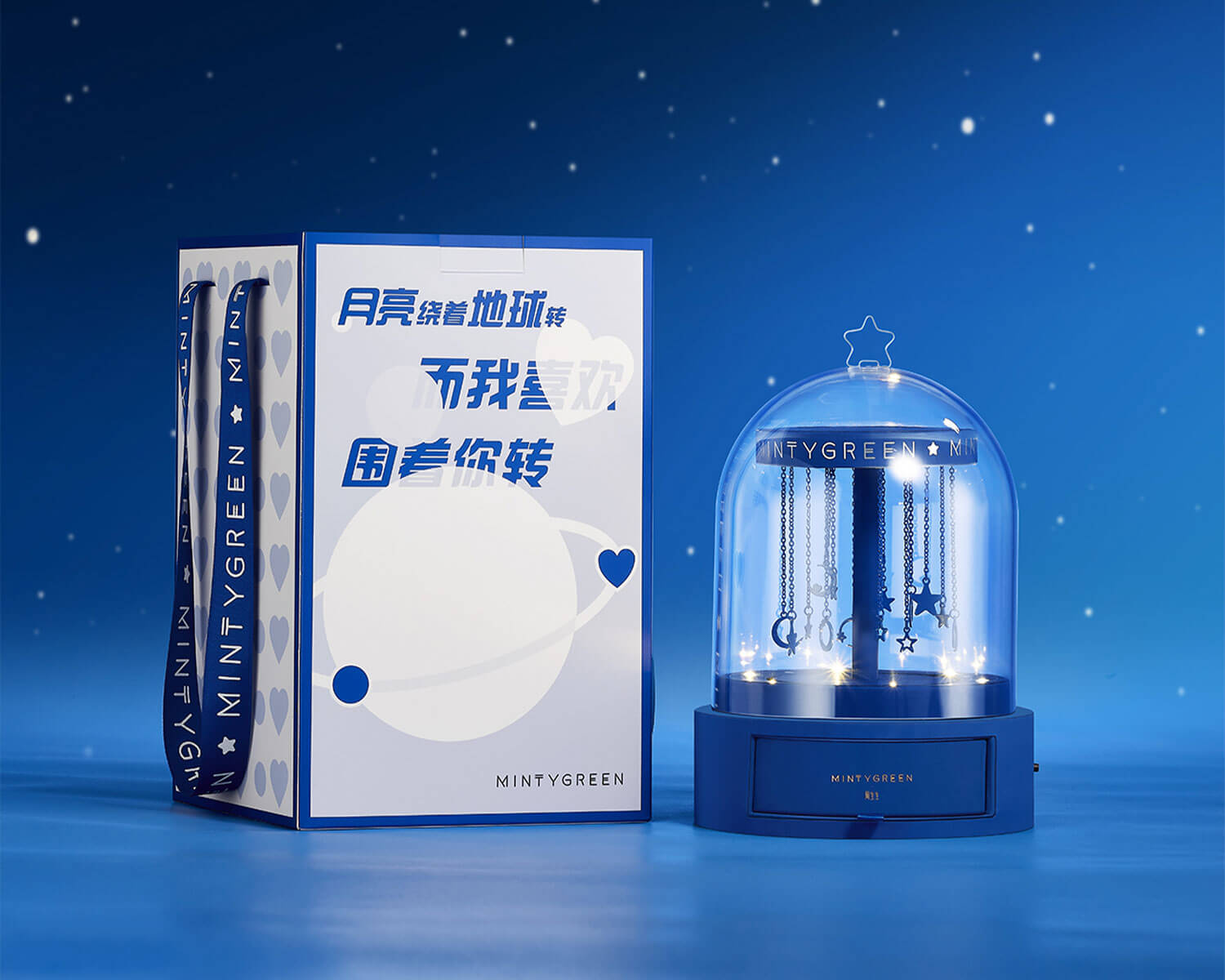 月亮繞地球旋轉(zhuǎn),我則傾心于圍繞你。設(shè)計師以玫瑰花玻璃罩為靈感,象征保護與關(guān)愛,結(jié)合旋轉(zhuǎn)木馬的浪漫,打造專屬女孩的夢幻之作。透明亞克力罩下,星月掛飾點綴,如宇宙星河般浩渺,仿佛七夕的牛郎織女,雖遠隔光年,眼中卻唯有彼此,演繹著不朽的浪漫傳奇。